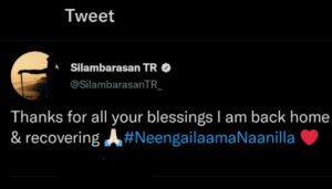 இந்த நிலையில் நடிகர் சிம்பு தனது டுவிட்டர் பக்கத்தில் , “மருத்துவமனையில் இருந்து நான் வீடு திரும்பி விட்டேன். தற்போது மெல்ல குணமடைந்து வருகிறேன். எனக்காக பிராத்தனை செய்த ரசிகர்கள் அனைவருக்கும் நன்றி. நீங்க இல்லாமல் நான் இல்லை” என தெரிவித்துள்ளார்.