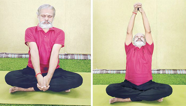 கண் பயிற்சி: நிமிர்ந்து அமரவும். இரு கட்டை விரல் சேர்ந்திருக்குமாறு கை விரல்களையும் கோர்த்து படத்தில் உள்ளது போல் கீழிருந்து மெதுவாக தலைக்கு மேல் உயர்த்தவும். கண் விழிகள் கட்டை விரலை நோக்கி மேலே கொண்டு செல்லவும். தலைக்கு மேல் கைகளை உயர்த்தும் பொழுது, கண்களை மேல் நோக்கி பார்க்கவும். பத்து வினாடிகள் இருக்கவும். பின் மெதுவாக தலைக்கு மேலிருந்து கீழ்நோக்கி கைவிரல்களை கொண்டு வரவும். இதுபோல் இரண்டு முறைகள் பயிற்சி செய்யவும்.