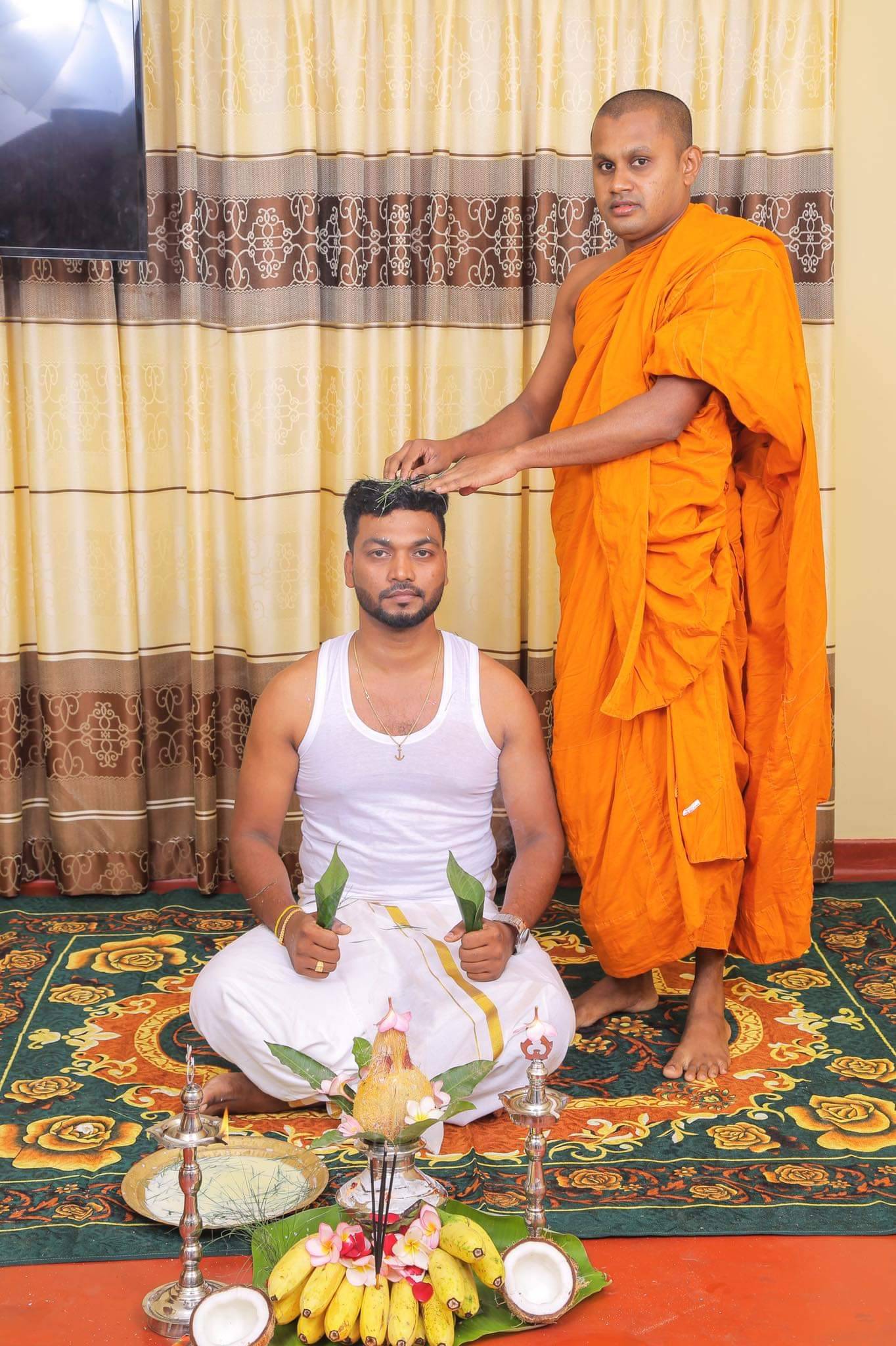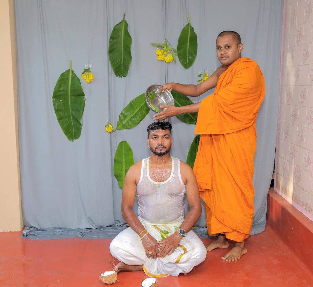அதோடு திருமணவீட்டில் இந்துக்களின் பாரம்பரிய முறைப்படி தேரர் மணமகனுக்கு பால் அறுகும் வைத்துள்ளார்.