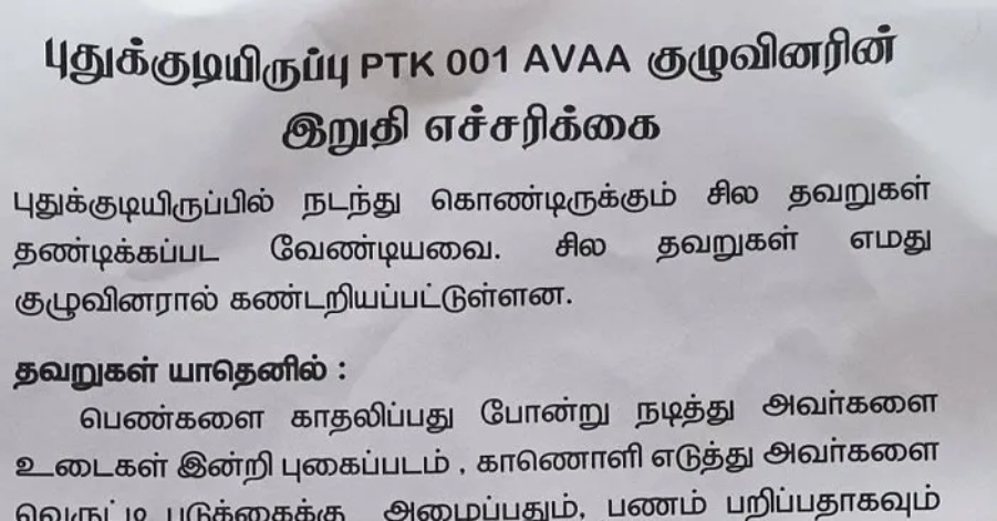 குறித்த துண்டுப்பிரசுரத்தில் பாலியல் துஸ்பிரயோகம், மிரட்டி பணம் பறித்தல், போதைப்பொருள் விற்பனை செய்பவர்கள் என தவறு செய்வோர் அனைவருக்கும் தகுந்த தண்டனை வழங்கப்பட இருக்கின்றது என எச்சரிக்கை விடுக்கப்பட்டுள்ளது.