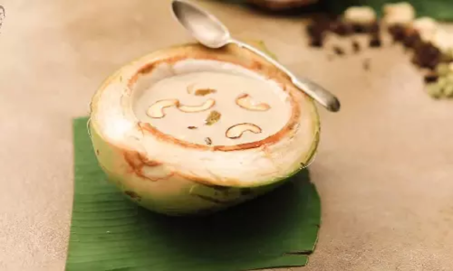 பாதாம் பருப்பை ஊறவைத்து தோலுரிக்கவும். பின்பு முந்திரி, பாதாம், பிஸ்தா இவற்றை பொடிதாக நறுக்கவும். இளம் தேங்காயை சிறு சிறு துண்டுகளாக நறுக்கி மிக்சியில் போட்டு சிறிது பாலூற்றி நன்றாக அரைத்துக்கொள்ளவும். பின்பு அதில் இளநீரை சேர்த்துக் கலக்கவும். அடிப்பகுதி கனமான பாத்திரத்தில் பாலை ஊற்றி சூடுபடுத்தவும். அதில் மில்க்மெய்ட் சேர்த்து நன்றாகக் கலக்கவும். பிறகு தேவையான அளவு சர்க்கரை சேர்க்கவும். பிறகு அதில் பச்சைக்கற்பூரம், ஏலக்காய்த்தூள் சேர்த்து நன்றாகக் கிளறவும்.