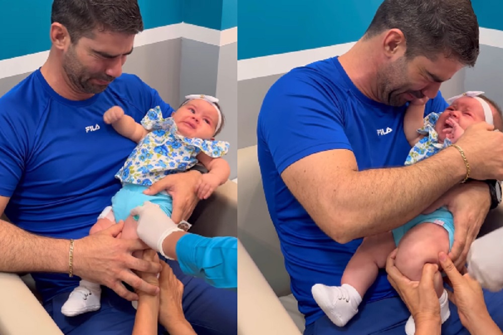 அப்போது மருத்துவர் ஊசியை குழந்தையில் அருகில் கொண்டுவரும் போதே அந்த தந்தை அழ தொடங்கிவிடுகிறார்.
