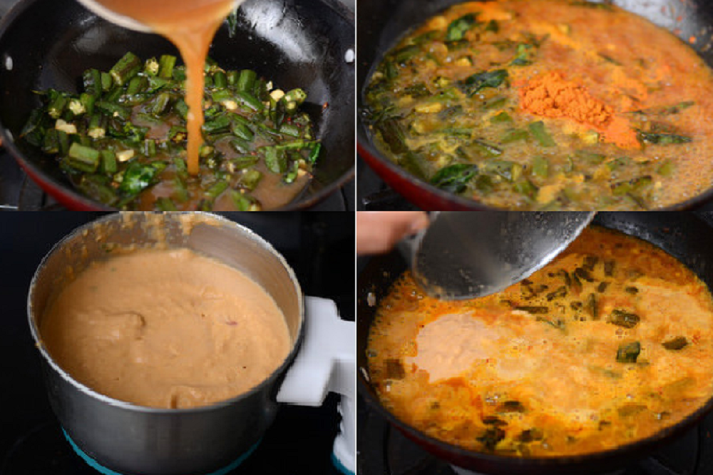 பூண்டு வாசனை வந்ததும், வதக்கிய லேடீஸ் ஃபிங்கரைச் சேர்க்கவும். பின்னர் புளிச்சாறு பிரித்தெடுத்து, தண்ணீரை 2 ½ கப் தண்ணீர் சேர்த்து நன்கு கொதிக்க விடவும்.