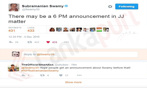 இதனை அடுத்து தற்போது எமக்கு ஒரு திடுக்கிடும் தகவல் கிடைத்துள்ளது. தமிழக முதலவர் ஜெயலலிதாவின் உடல் நிலை மிகவும் மோசமாகவுள்ளது என்றும் அவரின் உயிர் இன்று மாலை 6 மணியுடன் பிரிந்து விடும் எனவும் சுப்பிரமணியம் சுவாமி அவரின் டூட்டர் பக்கத்தில் அதிர்ச்சி மிக்க இத் தகவலை வெளியிட்டுள்ளார்.