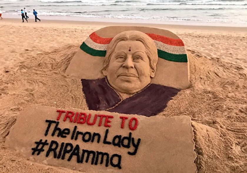 இன்று, மறைந்த முதல்வர் ஜெயலலிதாவின் உடல் நல்லடக்கம் செய்யப்பட்டது. ஜெயலலிதாவுக்கு மரியாதை செலுத்தும் விதமாக பட்நாயக், ஒடிசாவில் உள்ள பூரி கடற்கரையில், ஜெயலலிதாவின் முகத்தை மணல் ஓவியமாக உருவாக்கி தனது மரியாதையை செலுத்தியுள்ளார்.
