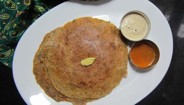 * தோசை கல்லை அடுப்பில் வைத்து சூடானதும் மாவை ஊற்றி சுற்றி சிறிது எண்ணெய் ஊற்றி வெந்ததும் திருப்பி போட்டு வேக வைத்து எடுக்கவும்.