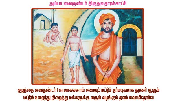 அதர்மம் தலைதூக்கும் போதெல்லாம் தர்மத்தை நிலைநாட்ட ஆண்டவன் அவதாரங்களை எடுப்பார். அதேபோல் இந்த கலியுகத்தில் பல்வேறு பிரச்சினைகளால் அதர்மம் தலைதூக்க, அதை அழித்து தர்மத்தை நிலைநாட்ட அய்யா வைகுண்டர் அவதாரம் எடுத்தார். சிவன்- பிரம்மா- விஷ்ணு ஆகிய மும்மூர்த்திகளும் இணைந்த ஒரே மூர்த்தியாக அவர் உருவானார்.