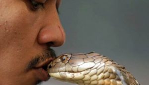 அதுவரை அமைதியாக இருந்த பாம்பு திடீரென ஆவேசமடைந்தது. முத்த மிட்ட அவரின் நாக்கில் ‘நச்‘ சென கொத்தி விட்டு கையில் இருந்து நழுவி கீழே விழுந்து ஓடி விட்டது.