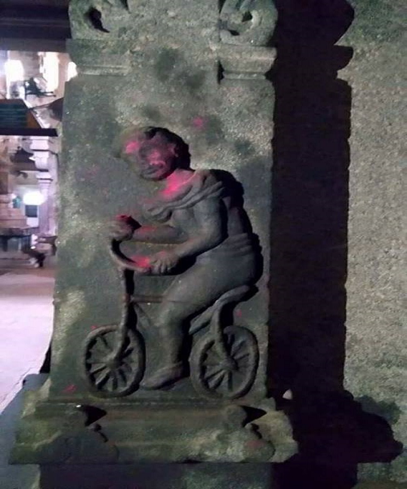 தற்போது இந்த கோவிலில் உள்ள ஒரு கல்வெட்டில் சைக்கிளின் மேல் ஒருவர் அமர்ந்திருப்பது போல புகைப்படங்களின் வெளியாகி உள்ளது.